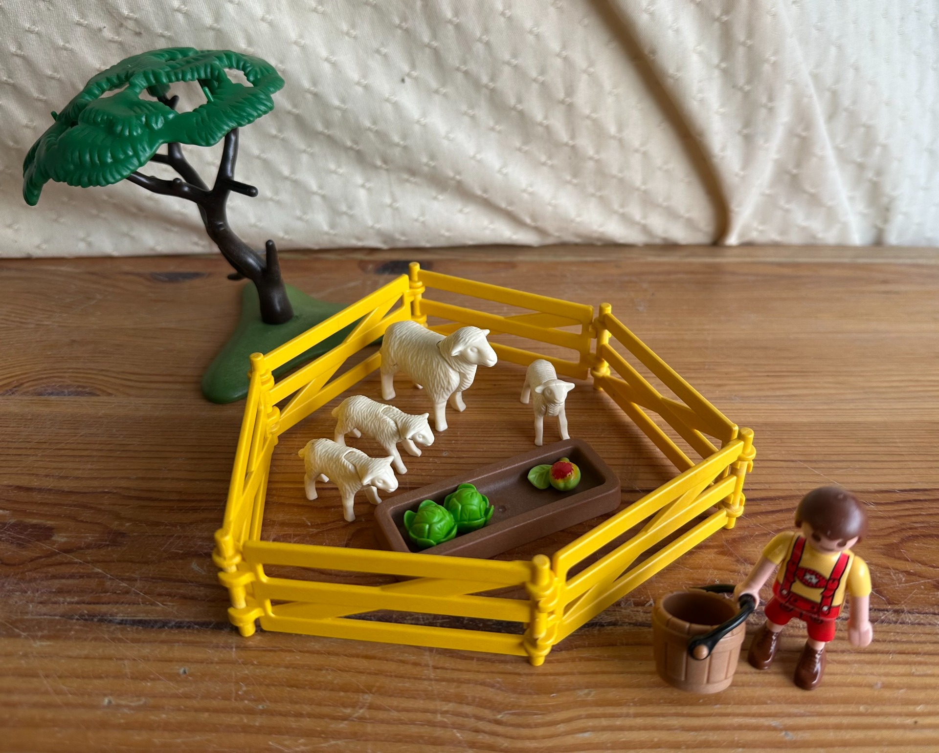 Playmobil jongetje met schaap en lammetjes en hekken met boom.